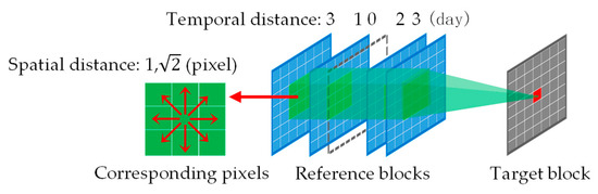 where is the preliminary NDSI of pixel in the target block. represents the NDSI in the reference block. denotes the number of reference blocks, with each containing reference pixels. The weight of the reference pixel, which is determined by its temporal and spatial distance to the target pixel , consists of the temporal weight and spatial weight , as shown in Equation (4):