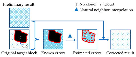 (3) Error correction. The corrected result is determined by the subtraction of the new errors from the preliminary result. After all the blocks are processed, the next loop of STF-GKF-EC begins until there is no cloud (see Figure 2).