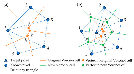 where is the estimation at based on the weighted combination of references . is the weight associated with the known neighboring pixel . Figure 6 shows the Voronoi diagrams for weight calculation. Specifically, Figure 6a shows the Voronoi diagram of pixels 1–5 based on the Delaunay triangles, in which f–h are the three vertices. When a target pixel T is included, its natural neighbors are those to which it is connected through the sides of the Delaunay triangles (pixels 1–5). A new Voronoi diagram is generated, as shown by the green line in Figure 6b, in which a–e are the five vertices in the Voronoi cell of pixel T. Taking pixel 1 as an example, the weight is given as follows: