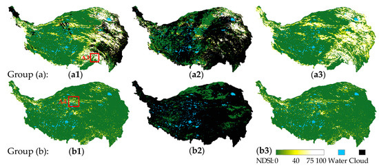 Since STF-GKF-EC was recursively performed, the clouds were removed iteratively. In the simulated experiment, the average cloud cover of the original data, the three intermediate products, and the final results on the 10 days were 62.61%, 26.58%, 2.38%, 0.09%, and 0, respectively. It should be noted that the number of iterations depends on the spatio–temporal cloud cover. The method automatically adjusts the number of iterations based on the remaining cloud coverage. For brevity, only two instances are shown in Figure 7. As can be seen from group (a), although the cloud cover of the “observed data” on 24 March 2016, is as high as 67%, STF-GKF-EC completely removes the clouds, and the cloud-free result shown in Figure 7 (a3) has a good consistency with the “ground truth”. Group (b) shows the results for 10 September 2017, with an extremely high cloud cover of 88% in the “observed data”. In this case, STF-GKF-EC restores the high values in snow-covered areas and retains the normal low values in snow-free areas. However, there are also a few misclassified pixels in the cloud removal result, mainly in the southeast of Brahmaputra and the interior of Qaidam. In these areas, the original reference images misidentified salt lakes, clouds, etc. as snow, leading to commission of the results. On the whole, the proposed method can remove all the clouds and restore the snow patterns with a high reliability.