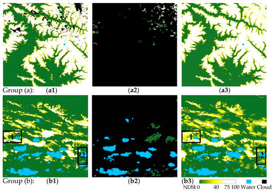 To further verify the experimental results, the details of the red rectangular areas A3 and A4 (see Figure 7) are displayed in Figure 8. For group (a), it is clear that the result in (a3) is very pleasing, restoring the detailed information of the snow cover and preserving the spatial continuity with the original NDSI. As for group (b), the snow patterns of the cloud-removed result in (b3) are similar to those of the “ground truth” in (b1). However, some misclassified pixels can be observed at the edge of the snow cover (see the black rectangular areas). The reason is that the reference information is scarce owing to the continuous cloud presence in both the time sequence and the spatial neighborhood. In general, when there is no effective information in the adjacent five days during the period of snow accumulation or ablation, the reconstruction accuracy will be relatively poor in the area without the neighborhood information. Overall, STF-GKF-EC can recover all the NDSI of cloud-contaminated pixels, with a high agreement with the “ground truth”.