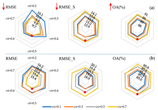 Since the spatial and temporal weights are unified by the GKF, the two parameters in the GKF need to be determined. Figure 9 shows the results of the parametric test for 24 March 2016, and 1 October 2016, including the RMSE, RMSE_S, and OA values corresponding to different matrices of [, ]. For simplicity, the parameter testing was only performed on “A1” and “A2” (see Figure 1), and error correction in STF-GKF-EC was omitted. The different colors and vertices of the polygon represent different spatial and temporal parameters, respectively. The vertical comparison shows that the impact of the spatial parameter on the accuracy is highly consistent in the different regions, while that of the temporal parameter is relatively complex. From the horizontal perspective, as the value of the spatial parameter increases, the OA and RMSE are improved, while the RMSE_S is worse. The reason is that the OA and RMSE are significantly affected by the proportion of snow-free areas, while RMSE_S is the opposite. Specifically, when the spatial parameter value is 0.5 or 0.7, the OA and RMSE of both regions show a higher accuracy, while a value of 0.5 performs significantly better than 0.7 in terms of RMSE_S on A2. Therefore, is regarded as the optimal parameter setting. In addition, when the temporal parameter value is set as 0.5, the RMSE and RMSE_S of “A1” and the RMSE_S of “A2” show good performance. Thus, the parameter matrix [0.5, 0.5] is recommended in STF-GKF-EC.