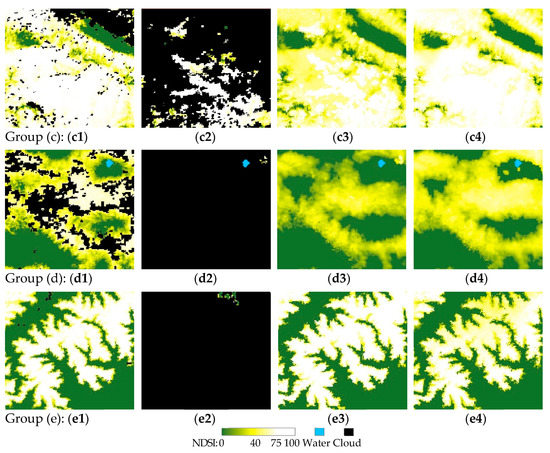 As stated above, the error correction further improves the numerical accuracy and spatial consistency of the NDSI data, especially during periods of rapid changes in snow cover. The effect of the error correction is affected by the quantity and distribution of the original effective data. Figure 10 shows three specific effects (groups (c)–(e)) extracted from the results for 24 March 2016, where the cloud removal results of STF-GKF-EC are compared with those of the method without error correction. Group (c) presents an example with an excellent correction effect. Since the snow cover in this area varies greatly over a few days, the NDSI values filled with the information of the reference images are significantly underestimated, as shown in (c3). In this case, based on the original effective information of the target image, the error correction can greatly improve the reconstruction accuracy. However, group (d) reveals that the correction is likely to be insufficient when the spatial information is scarce. In addition, original effective data with an extremely uneven spatial distribution may introduce incorrect error information, due to the lack of representativeness, resulting in excessive correction, as shown in group (e). The NDSI in (e3) is slightly overestimated at the edge of the snow-covered areas, and is covered by clouds in other snow-covered areas. Accordingly, nearby cloud-covered areas are mistakenly considered to be overestimated, thus correcting these overestimates and leading to underestimation. In general, although there are some insufficient and excessive corrections, the error correction can effectively eliminate the temporal errors introduced by the reference images, indicating that it is an essential component of the proposed method.