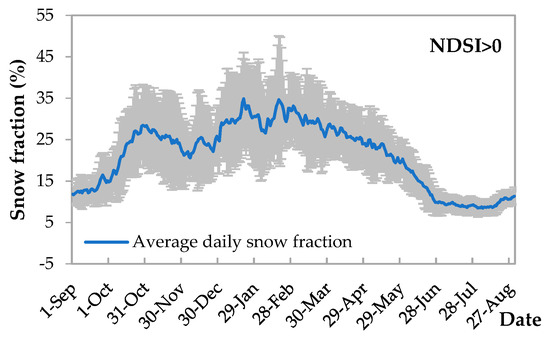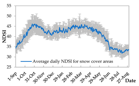 The intra-annual variability was analyzed at both the daily and monthly scales. First, the average daily snow fraction (the ratio of NDSI greater than 0) and the average daily NDSI for snow-covered areas in a hydrological year are shown in Figure 11 and Figure 12, respectively. The gray error bars represent the standard deviation. It can be seen that the daily snow fraction over the TP fluctuates greatly, with a maximum of 34.87% on 20 January and a minimum of 8.45% on 5 August. In comparison, the average daily NDSI for the snow-covered areas rises earlier and falls later, with a maximum of 46.11 on 24 October and a minimum of 31.80 on 9 August. In other words, on the one hand, snow accumulation first occurs in areas with high NDSI values, and then spreads to snow-free areas. On the other hand, snow ablation starts from areas with low NDSI values, and then moves to areas with high NDSI values. However, in general, their changes are highly consistent, with a correlation coefficient of 0.91.
