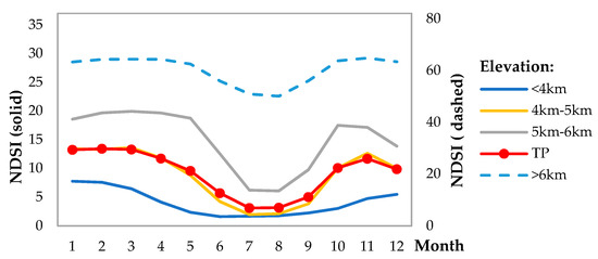 Annual cycle of average NDSI at different elevation zones over the TP during 2001–2017.