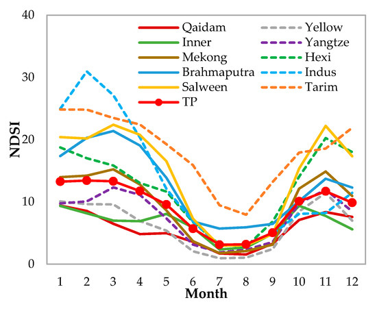 In view of the different subregions (see Figure 1), there are also some commonalities and individualities in the intra-annual snow cover variation, as shown in Figure 14. On the one hand, all the subregions quickly accumulate snow in September/October. Except for Tarim and Indus, all subregions have a lower NDSI in December. Furthermore, the snow cover in each subregion reaches a minimum in July/August. On the other hand, snowmelt onset occurs between January and March, depending on the subregion. Hexi, for example, has relatively high snow cover in November, but the snow begins to melt as early as January. The snow in Indus is almost exclusively concentrated between January and March, and then drops sharply to a very low proportion. In addition, it can be noticed that the Inner subregion has three peaks, which occur in January, May, and October, respectively. In contrast, Tarim, with a high average NDSI, has a smoother snow cover curve, retaining some permanent snow in summer. Moreover, the intra-annual snow variation curves of the Mekong and Yangtze river basins are the closest to that of the entire TP.