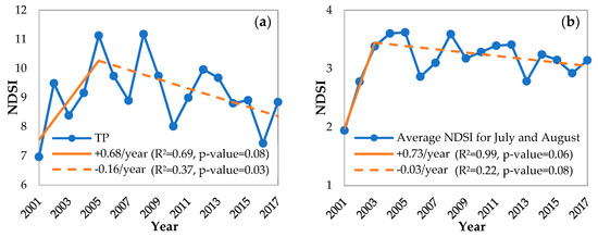 Firstly, the annual averages of NDSI over the entire TP from 2001 to 2017 are shown in Figure 15a. An apparent increasing trend can be observed during 2001–2005, as well as a slight decreasing trend during 2005–2017. Using the piecewise linear regression model, the trends are determined as being +0.68/year and −0.16/year, respectively. The trends are statistically significant (α = 0.10). Over the past decade, the annual average NDSI has fallen from more than 11 to about eight. In addition, since the snow cover reaches its lowest value in July and August, we can assume that the snow cover during this period is permanent snow cover. Figure 15b shows the changes of average NDSI for July and August over the 17 years. It can be seen that, after a rapid rise during 2001–2003, a slight decreasing trend of 0.03/year has lasted for 14 years.