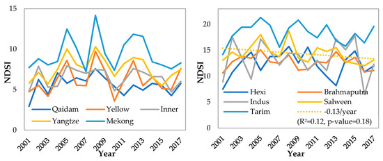 Moreover, according to the magnitude of the average NDSI, the 10 subregions over the TP are ranked as Qaidam, Yellow, Inner, Yangtze, Mekong, Hexi, Brahmaputra, Indus, Salween, and Tarim (see Figure 16). This reveals that the snow cover is high in the western, southern, and northern margins of the TP, and relatively low in the central and eastern regions. In addition, the snow cover in each subregion has fluctuated greatly over the 17 years. The linear regression equation of Salween has the smallest slope of −0.13/year. However, this trend is not statistically significant (α = 0.10).