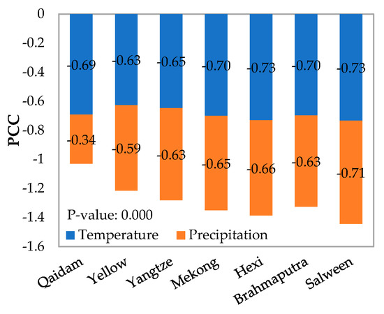 According to the Pearson correlation coefficients (PCCs) of the average monthly NDSI and temperature/precipitation from 2001 to 2016, Table 6 describes the correlation between the inter-annual variation of snow cover and the climatic factors. It can be seen that temperature has little effect on the inter-annual snow cover variation, with only February showing a significant negative correlation. Precipitation, in contrast, is typically positively correlated with the snow cover variation, especially in January and October. Moreover, the overall PCCs from October to March also indicate that precipitation has a greater effect on the inter-annual variability than temperature. However, the regional inconsistency is also significant, for example, the correlation coefficient is relatively low around the Yangtze River. In the Salween River basin, there is even an alternating positive/negative correlation. As a result, compared to the intra-annual variability in snow cover, inter-annual variability in snow cover exhibits a weaker correlation with both temperature and precipitation.