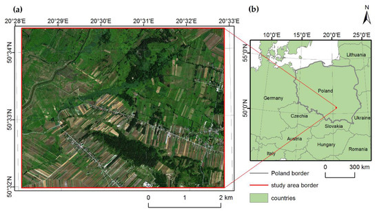 Study area location. Ostoja Nidziańska (a), basemap: HySpex image in natural colour Red, Green, Blue (RGB) composition, acquired in September 2017; Central Europe (b), basemap: © EuroGeographics for the administrative boundaries.