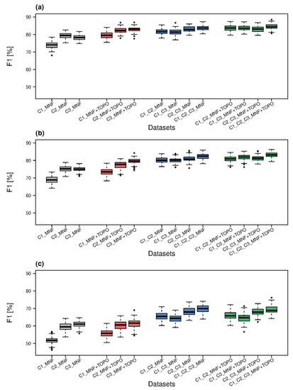 Each of the highest median F1 values for all three habitats was achieved with the C1_C2_C3_MNF + TOPO dataset (Figure 4). The best result for habitat 6210 (84.5%) was 0.7% better than the second best result (C1_C2_MNF+TOPO) and 5% higher than the highest F1 achieved with the respective one-data MNF dataset (Figure 4a). For habitat 6410, the best result of 83.2% was followed by 82.0% (C1_C3_MNF + TOPO), with the lowest accuracy of 80.9% was obtained using the C1_C2_MNF + TOPO dataset (Figure 4b). The maximum F1 accuracy achieved for habitat 6410 using all available data (83.2%) was 8.0% better than the best result achieved with one-date MNF bands. The results of 6510 habitat classification were in the range of 64.7% (C1_C3_MNF + TOPO) and 68.9%, with the second best accuracy (67.9%) captured by the C2_C3_MNF + TOPO dataset (Figure 4c). The difference between the highest F1 values for habitat 6510 achieved with one-date MNF bands and multitemporal MNF + TOPO data was 7.8%.
