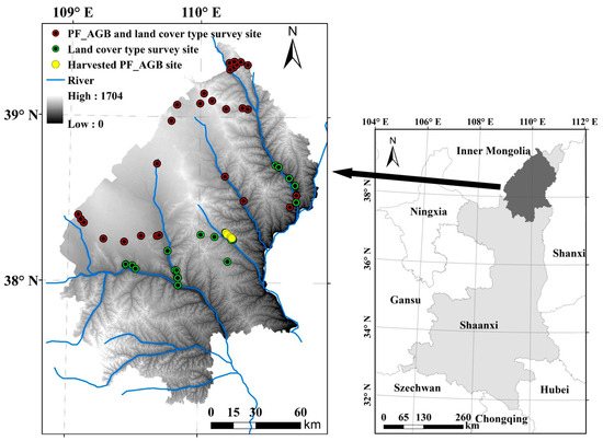 Yulin is located in Shanxi province on the border between the loess plateau and the Inner Mongolian plateau (Figure 1). It is an ecologically fragile area in the TNSFP region with some of the worst instances of erosion in the world [14,15,16]. As a result, Yulin receives a lot of attention from the Chinese government and international societies [23]. Its special geographical environment means that Yulin is undergoing severe desertification and soil erosion, with soil loss rates exceeding 30 g/km2 per year in some areas [24]. The ecological environment management objectives of TNSFP in Yulin are sand control and sand fixation. Yulin is also a useful case study for assessing the effectiveness of the TNSFP as a whole. Dynamic variation in the estimates of forest cover and forest biomass in Yulin can also reflect the effectiveness of the TNSFP. Primary land cover types in the study area include croplands, forest, grasslands, water bodies, urban and built-up, and barren or sparsely vegetated according to Moderate Resolution Imaging Spectroradiometer (MODIS) and other land cover type products [13,22]. Yulin’s climate is a temperate semi-arid continental monsoon climate with dry, windy conditions in spring; hot summers, when the majority of rainfall occurs; and dry, cold winters. Yulin has one of the highest sunshine durations in China, with not much precipitation. The annual total precipitation in the whole region is 310 mm to 510 mm, with most of the area receiving less than 450 mm. According to a field survey, the predominant tree species in the study area include Chinese pine (Pinus tabuliformis), poplar (Populus alba), and Chinese scholar (Styphnolobium japonicum).