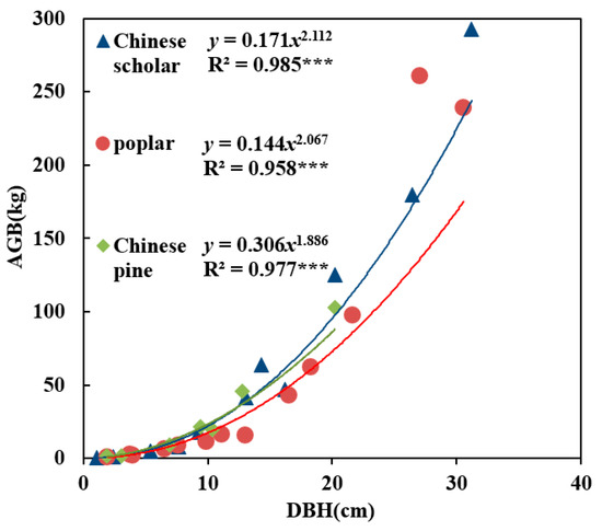 where a and b are constants. The relationships [7] between DBH and AGB for Chinese scholar, poplar, and Chinese pine developed for this study are shown in Figure 2.
