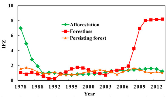 Typical IFZ values for afforestation, forest loss and persisting forest from 1978 to 2013 are shown in Figure 3. Persisting forest areas showed stable low IFZ values of around 1.5. Values decreased gradually after afforestation in 1978, ending with a similar annual trend of IFZ as that of persisting forest. The IFZ values of forest loss had the opposite trend from afforestation: stable low IFZ values were observed before forest loss occurred in 2006, followed by increasing IFZ values. Based on these characteristics, we extracted all afforestation areas and calculated their corresponding stand ages.