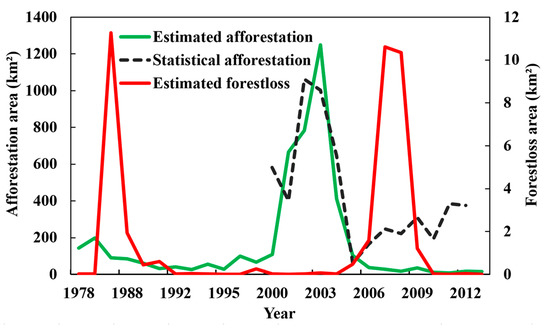Changes in estimated afforestation area (green lines, left-hand vertical axis), statistical afforestation area (black dotted lines, left-hand vertical axis), and forest loss area (red lines, right-hand vertical axis) in our study area from 1978 to 2013.