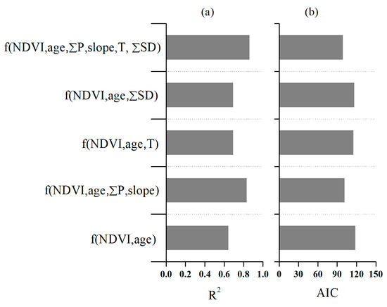 The determination (a): coefficient (R2) and (b): Akaike’s information criterion (AIC) for the models to estimate planted forest aboveground biomass (PF_AGB) by different variables. T, ΣP, and ΣSD mean annual average temperature, annual cumulative precipitation, and annual cumulative precipitation, respectively. NDVI, normalized difference vegetation index. f(NDVI, age) indicates that the model is based on NDVI and the exponent transformation of the stand age. f(NDVI, age, , slope) indicates that the model of f(NDVI, age) was combined with total precipitation, including the power function transformation of slope. f(NDVI, age, T) indicates that the model of f(NDVI, AGE) was combined with average temperature. f(NDVI, age, ) indicates that the model of f(NDVI, age) was combined with total sunshine duration. f(NDVI, age, , slope, T, ) indicates that the model considered all five variables.