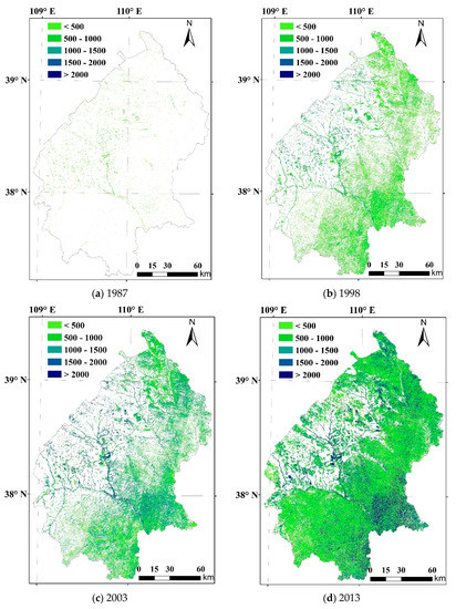 Figure 4 shows that afforestation was mainly conducted in the early 1980s and again in the early 21st century, while afforestation was stable during the periods of 1988–1997 and 2003–2013 (Figure 4). The PF_AGBs in 1987, 1998, 2003, and 2013 were calculated using models that considered NDVI, stand age, topographic (slope), and meteorological factors (total precipitation, average temperature, and total sunshine duration); i.e., the model of f(NDVI, age, , slope, T, ). Results were mapped to represent interannual changes of PF_AGB. The PF_AGB was about 0.25 G kg in 1987, 0.8 G kg in 1998, 1.84 G kg in 2003, and 6.13 G kg in 2013 (Figure 7).