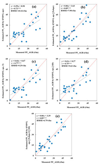 The leave-one-out cross-validation (LOOCV) approach, widely used for validation when the field observed samples are small, was employed. This method involves using one field observed value as a validation sample and the remaining field observed values as the training samples. This is repeated in all possible combinations to cut the original sample into a validation sample of one field observed value and a training sample [7,37]. Using the LOOCV approach, we validated PF_AGB based on the different models. We found that the estimated PF_AGB based on f(NDVI, age) had a correlation coefficient (r) of 0.72 (p < 0.001) and a root mean square error (RMSE) value of 10.16 t/ha. A marked increase in accuracy (r = 0.85, RMSE = 7.98 t/ha) was found when total precipitation combined with topographical factor (i.e., slope) were introduced. This combination was more accurate than the models of f(NDVI, age) combined with average temperature (f(NDVI, age, )) and total sunshine duration (f(NDVI, age, )) (Figure 8). The combination of all variables (f(NDVI, age, , slope, T, )) showed the highest accuracy (r = 0.89, RMSE = 6.79 t/ha) when estimating PF_AGB.