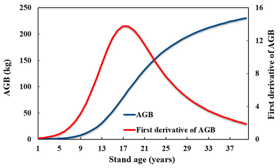 Relationship between stand-age and measured poplar (Populus alba) forest aboveground biomass (AGB) (blue lines, left-hand vertical axis), and the first derivative of the measured poplar (Populus alba) forest aboveground biomass (red lines, right-hand vertical axis).