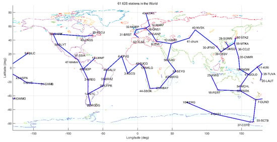 The architecture of the real-time precise GPS orbit filter is shown in Figure 1. The inputs to the filter are raw measurements, the broadcast (BRDC) orbit, and the International Earth Rotation and Reference System (IERS)-predicted earth orientation parameters (EOP). Raw measurements are acquired in the RINEX format from the IGS data archive [22]. Dual-frequency PR and CP data are acquired from 61 globally distributed stations across 30 s intervals. Figure 2 shows the station locations and baselines. The stations are chosen to form a station network with homogeneous receivers, Trimble receiver in this case, in order to avoid estimation of hardware bias errors. The mask angle is set to 5°. The IERS-predicted EOP is used for coordination transformation, and broadcast ephemeris is used for preprocessing.