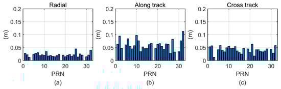 Figure 4 shows the root mean square (RMS) orbit errors of all satellites during the last 24 h of a given day. The mean 3D RMS value is 7.8 cm, and the radial track error is ~2 cm. The along-track error was larger than radial and cross-track errors.