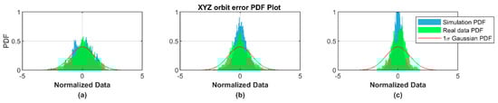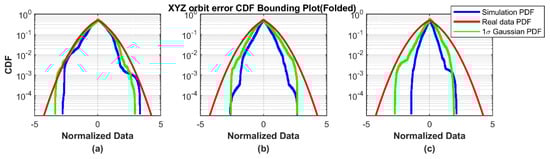 Probability density function (PDF) bounding plot of normalized error for all satellites and each axis. (a) X-axis; (b) Y-axis; and (c) Z-axis.