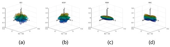 Figure 8 shows the entire satellite covariance after 23 h in the four different frames (ECI, ECEF, RSW, and RAC). In Figure 8a,b, the axis-to-axis correlation of a satellite is different from that of other satellites. On the other hand, all covariance ellipsoids of the RSW and RAC appear more uniform than those of ECI and ECEF. The estimated covariance in the RSW and RAC coordinate systems appear in the form of a long ellipsoid in the along-track direction. For the remainder of the study, we focused on the analysis to RSW and RAC frames.