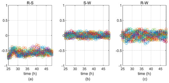 Correlation time history for 29 satellite vehicles. (a) R-S; (b) S-W; (c) R-W.