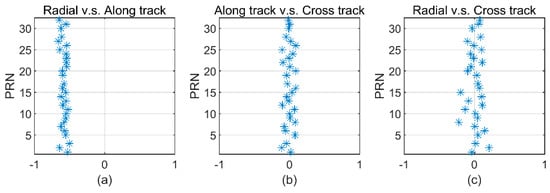 Correlation of each satellite and each axis of new radial along- and cross-track (RAC) frame. (a) Correlation of radial and along track; (b) correlation of along-track and cross-track; (c) correlation of radial and cross-track.