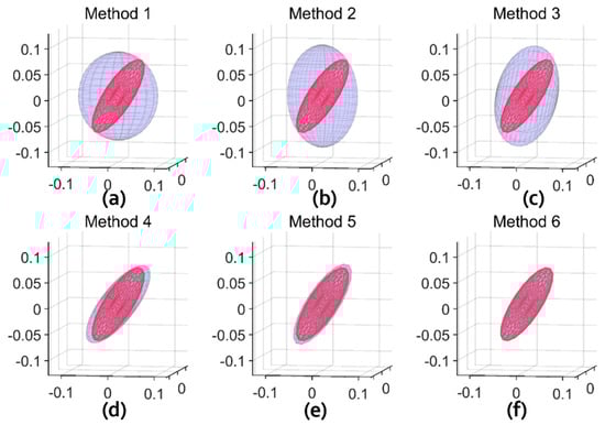 Pseudo-random noise (PRN) 9 covariance ellipsoids of different methods. (a–f) Method 1 through 6, where red is the actual covariance and the purple ellipsoids are the provided ellipsoids.