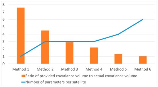 This study evaluates each candidate method by means of the ratio of the provided covariance volume to the full covariance volume. Figure 12 shows the full and provided covariance at 24:00 on 16 January 2018. Figure 13 and Table 9 present the number of parameters required for each satellite for each method and the visualization of the full and provided volume, respectively. Table 9 summarizes the error covariance for all satellites. These results indicate that Method 1 requires only one parameter to generate the error covariance. However, it broadcasts ~ 8 times the error covariance, as indicated in Table 9. With the use of the standard deviation values for each axis, Methods 2 and 3 are able to generate 4.5 and 2.9 times the error covariance. Method 4, which uses the new RAC frame, reduces the error covariance volume to 2.2. Methods 5 and 6 (with its one additional parameter) exhibit very similar performances.