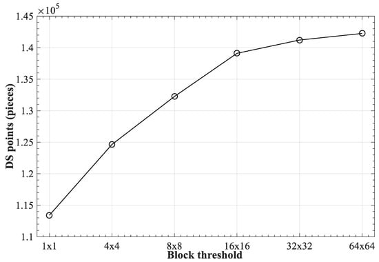 A mountainous area in Yunnan province, southwest China, was selected for the experiment and the regional coherence coefficient is shown in Figure 1. The region was partitioned into 8 × 8, 16 × 16, 32 × 32 and 64 × 64 blocks and the average coherence coefficient value was calculated for each block. The results are shown in Figure 2a–d. The DSC points within the extracted region and the corresponding calculation times are shown in Table 1, the relationship between block threshold and extracted points is shown in Figure 3.