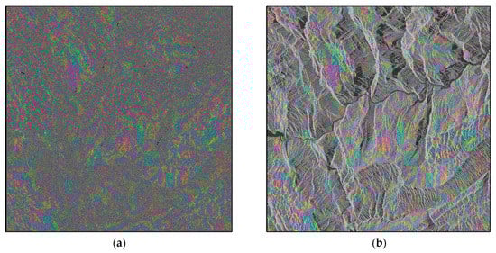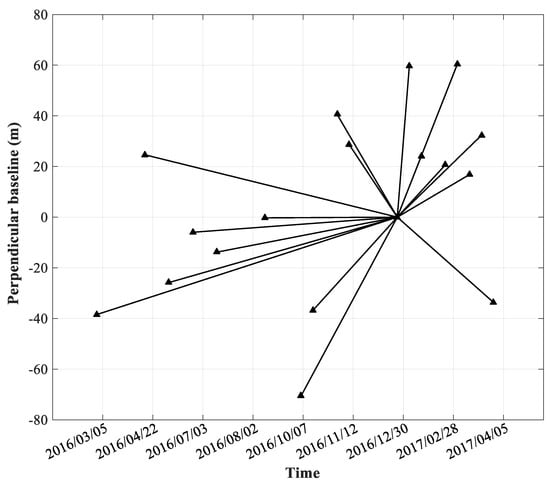 The radar image acquired on 30 December 2016 was used as the single main image in the experiment and all other images were used as auxiliary images to form a total of 17 interference image pairs. The time-space baseline distribution is shown in Figure 6. The interference pattern formed by the 20161230–20160703 interference pair was used as an example (Figure 7). Due to the dense vegetation and smaller artificial surface area, the interference fringes in the interference pattern are sparse and the interference effect is poor.
