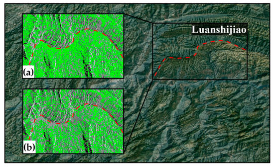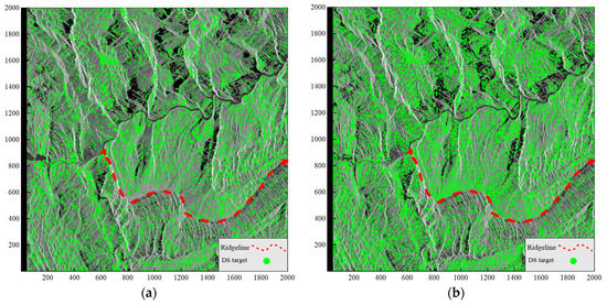 Luanshijiao area, shown in Figure 10, is used as an example; it is densely vegetated and belongs to a low coherence area. In the figure, (a) is the detection point target result of the ADS-InSAR method and (b) is the detection point target result of the DS-InSAR method. By combining the results with the topographic map, it is clear that the area above the red wavy ridgeline is covered by dense vegetation and the number of point targets extracted by the two methods are almost same. And the area below the red wavy ridgeline contain many villages, among which there are many roads and bare lands. Although these features with vegetation coverage may result in a decrease of coherence, they have stable phase in time series and can be scatterer targets. After the adaptive threshold is determined for the ADS-InSAR method, the point targets can be extracted.