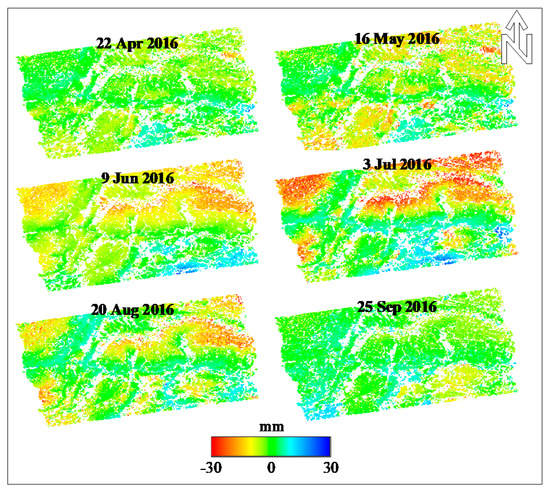 The results of the regional deformation time sequence are shown in Figure 12. The majority of time points of large-scale deformation in this region are from June 2016 to August 2016. The left part and upper right part of the region shows settlement changes from May 2016, whereas the middle part shows uplift changes. With time, the subsidence and uplift conditions become gradually weaker.