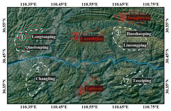 According to the DS average annual deformation rates in Figure 11 and the deformation sequence results in Figure 12, seven suspected landslide areas are detected in the experimental area—zone 1: Longtanping village and Qiaotouping village; zone 2: Luanshijiao area; zone 3: Huoshaoping village and Liusongping village; zone 4: Jiangjiawan village; zone 5: Changling village; zone 6: Fujiayan village; and zone 7: Taoziping village. As shown in Figure 13, the white areas show the confirmed landslide areas and the red areas show suspected landslide areas. Although the suspected landslide areas lack relevant data and evidence, an analysis of local historical data and surrounding environmental factors suggests that some of the landslide points are ancient small-scale landslides and are under continuous monitoring by the relevant departments. Moreover, due to the precipitation and hydropower station discharge caused by the increased groundwater, surface uplift in the experimental area is mainly concentrated in the Qingjiang river basin.