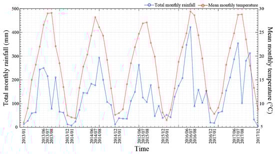 The study area has a subtropical monsoon climate with abundant rainy season rainfall, which is mainly concentrated in summer. According to meteorological and hydrological data of this region, the total monthly precipitation and mean monthly temperature of this region from January 2013 to December 2017 was calculated (Figure 14). The broken line chart of rainfall and temperature indicates that the study area is hot and rainy in summer and cold and dry in winter. And the precipitation in June and July 2016 reached its peak in recent years. Abundant rainfall very readily induces landslides for the following four reasons—(1) heavy rain causes a large amount of surface water to infiltrate into the ground, continuously eroding the weak layer and reducing the mechanical strength of the rock and soil [37]. Additionally, the infiltration pressure of pore water reduces slope stability, thereby inducing landslides [38]; (2) Heavy rain increases underground water and soil water content and significantly decreases the shear strength of soil. Moreover, as the underground water level increases, the soil weight and moisture increases, further resulting in weakening of soil slope convergence, slope displacement and landslides [39,40]; (3) Rainfall leads to an increase of groundwater velocity, which intensifies the subsurface erosion of soil by groundwater, damages slope stability and induces landslides [40]; (4) The continuous increase of groundwater will generate hydrostatic pressure within cracks in the soil mass, increasing the sliding thrust of the slope body and subjecting the sliding surface to upward supporting force, thereby reducing slope stability and inducing landslides [41,42,43].