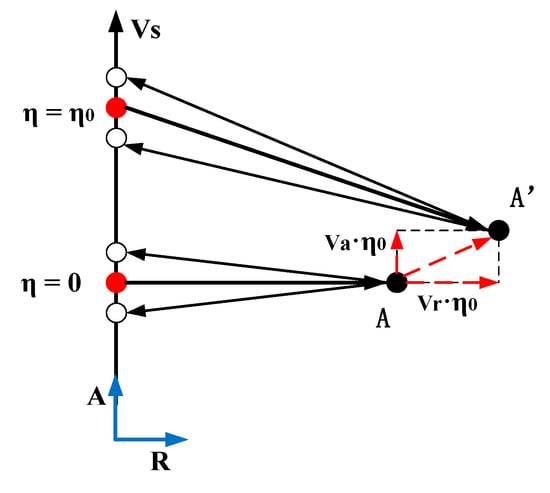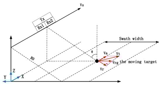 It is noted in Equation (11) that the existence of the along-track velocity makes the Doppler rate of the moving target different from that of the stationary one, which will result in the moving target being unfocused. However, fortunately, the autofocus technology has solved the problem and, at the same time, the estimated result of the along-track velocity can be obtained. Thus, to pay high attention to the effects of the radial velocity, the along-track velocity is ignored in the following derivation. The Doppler rate becomes: