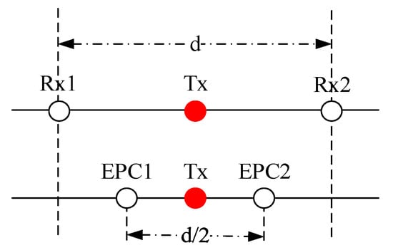 For the convenience of expression, the moving target is modeled as an ideal point target. The entire antenna is employed to transmit the chirp signal and is divided into two sub-apertures to receive echoes. represents the transmit phase center, and and represent the phase centers of two actual receiving antennas. By compensating a constant phase with respect to the reference channel, the received data can be converted into the equivalent self-transmitting and self-receiving data corresponding to the effective phase center (EPC) []. Figure 2 shows the relationship between actual receiving channels and effective receiving channels. The distance between adjacent actual phase centers is , while that between adjacent EPCs is .