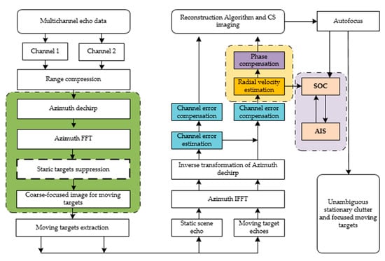 The whole processing flow for the simultaneous imaging scheme is shown in Figure 4. In the first step, the moving target echoes are extracted from the stationary clutter. For the maritime scenarios, we adopted an effective and efficient approach to extract the moving targets. A coarse-focused image is obtained after range compression and an azimuth dechirp operation. In more practical applications, it is able to extract multiple moving targets without clutter suppression, which is marked with a dotted box. Then, both the static scene echo and the moving target echoes need to return to the range time-azimuth time domain in two steps. Since the estimation of the channel imbalance is affected by the moving targets, it is necessary to estimate the channel imbalance with the static scene echo. The estimated result is used to compensate the channel error of moving targets. In order to achieve simultaneous processing of static and moving targets, the phase terms introduced by radial velocity need to be compensated. Lastly, the moving targets echoes are added back to the stationary scene echo and an unambiguous image can be obtained by the reconstruction and the classical CS algorithm. The along-track velocity is calculated by the autofocus algorithm and speed over ground of the moving ship is confirmed by comparing the velocity in the AIS sensor data. Three crucial steps will be explained in detail below.