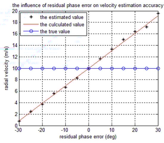 The influence of the residual phase error on velocity estimation accuracy is shown in Figure 5. The true value of the radial velocity is 10 m/s. The calculated value is obtained, according to Equation (46), while the estimated value is the result of the TDC method. In the DRC mode of GF-3, the residual phase error per 1 degree will bring an error of 0.3049 m/s to the radial velocity estimation result.