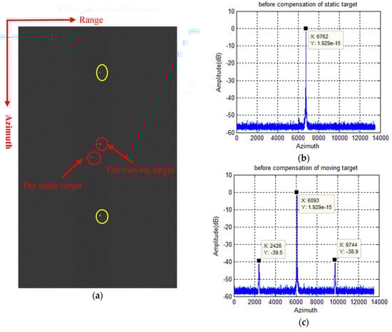 In this case, we present the imaging result of simulated echo data without any operation on the moving target in Figure 6a. The main targets are circled in red, while the false targets of the moving target are in the yellow circles. False targets will arise along the azimuth direction in the imaging results if the moving target is addressed along with the static one. The azimuth profiles of imaging results are shown in Figure 6b,c, which correspond to the azimuth profiles of the static target and the moving target in Figure 6a, respectively. The maximum power of false targets relative to the real one is −38.9 . From Figure 6, the moving target is focused on the incorrect azimuth position since it should be the same as the static target.