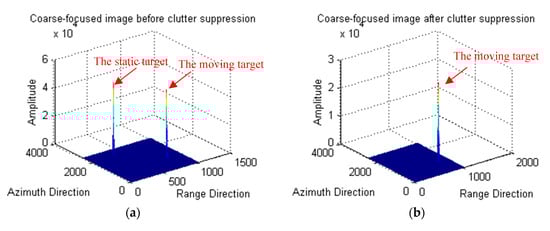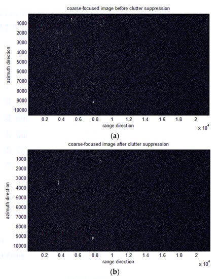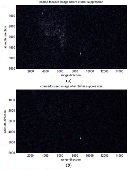 Results of coarse-focused image: (a) before clutter suppression and (b) after clutter suppression.