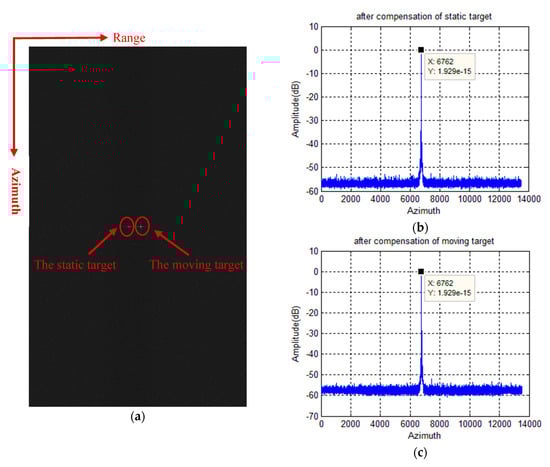 Results after phase compensation for the moving target: (a) the imaging result of the simulated echo data with a proposed processing flow, (b) the azimuth profile of the imaging result for the static target, and (c) the azimuth profile of the imaging result for the moving target.