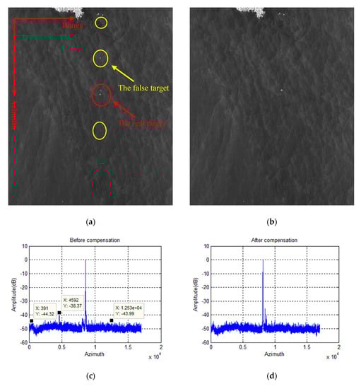 Imaging results of Scene 1 with a moving ship: (a) before compensation for the moving target echo, (b) after compensation for the moving target echo, (c) azimuth profile of the imaging result before compensation, and (d) the azimuth profile of the imaging result after compensation.