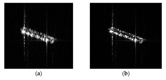 The first channel data is transformed into the range time-azimuth dechirp frequency domain to obtain a coarse-focused image shown in Figure 7a, which includes both the moving target and the static target. However, when we subtract the data of two channels after registration, the static target is suppressed, as shown in Figure 7b.