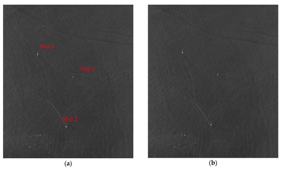 Imaging results of Scene 2 with three moving ships: (a) before compensation for the moving target echoes, and (b) after compensation for the moving target echoes.