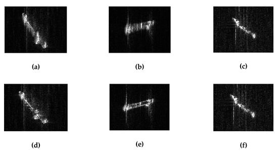 The result of the autofocus technology: (a) defocused image of ship1, (b) defocused image of ship2, (c) defocused image of ship3, (d) well-focused image of ship1, (e) well-focused image of ship2, and (f) well-focused image of ship3.