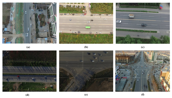 Aerial images captured from our Unmanned Aerial Vehicle (UAV) system, including a variety of complex scenes posing various challenges for target tracking: (a) adhesion occurring between two adjacent cars, (b) massive vehicles on side of the road, (c) complex background, (d) many tree shadows, (e) small target size and similar target appearance, (f) large changes in target size and complicated target movement.