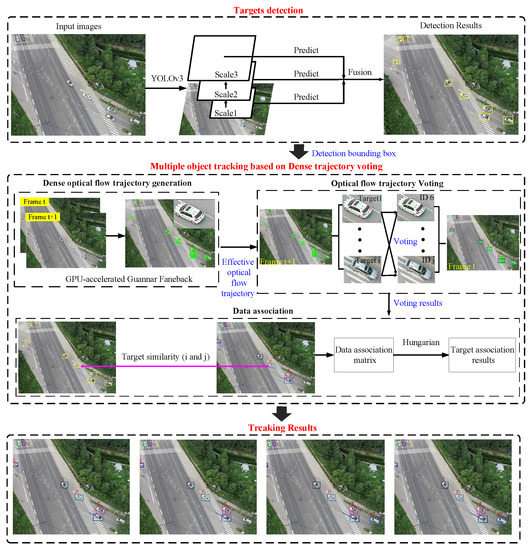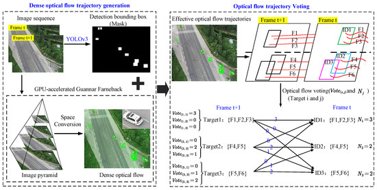 A framework of the proposed multiple-target-tracking algorithm based on dense-trajectory voting is shown in Figure 2. The framework can be divided into three parts, target detection, dense-optical-flow-trajectory generation and voting, and data association based on dense-trajectory voting, which are described in the following sections. In the first part, we trained the neural-network model and utilized deep-learning detection algorithm YOLOv3 [26] to obtain the detection bounding box of the vehicle. The method extracted multiple features of images in different scales, then predicted detection bounding boxes and probabilities for each one and fused them to get the final detection result. In the second part, dense-optical-flow-trajectory generation and voting, we first used the GPU-accelerated Gunnar Faneback algorithm to process adjacent frames and obtain the optical flow of each pixel in the current frame. Since we were only interested in the optical-flow trajectories of the targets, effective optical-flow trajectories in the current frame could be generated by combining the detection bounding box. On this basis, according to the target ID of these optical flow trajectories in Frame t, ID voting and statistics are carried out for each target in Frame t + 1 in the process of optical flow trajectory voting. In the third part, we used the voting results to measure the similarity of objects in adjacent frames and generate the data-association matrix. Then, we adopted the Hungarian algorithm [27] to assign the ID of these targets and obtain the tracking results.